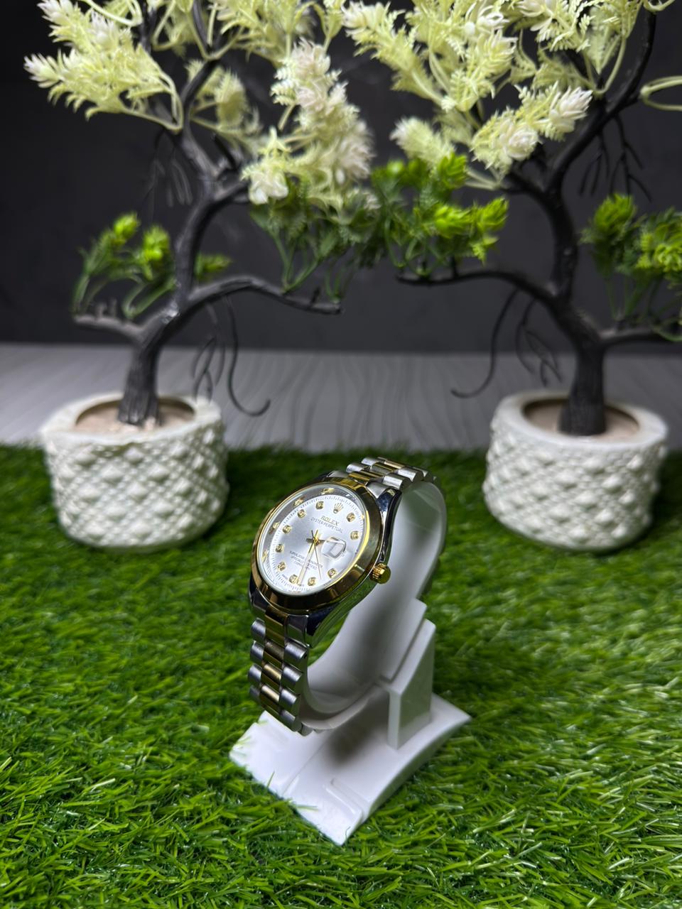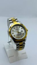 Enhance your style with this refined two-tone wristwatch designed for timeless elegance. The clean white dial creates a bright and classy look, beautifully complemented by the polished gold-tone bezel.